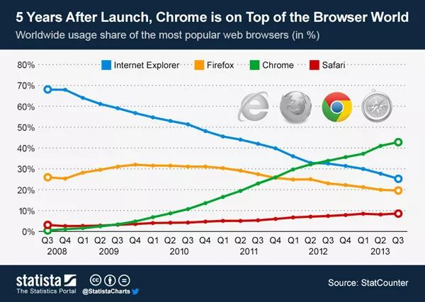 2008年9月,整合了谷歌搜索以及全家桶服务的Chrome浏览器正式上线,初始市场份额只有1%,而IE浏览器的份额是66%;五年以后,Chrome超越IE和火狐,成为全球第一大浏览器。在此期间,皮查伊也顺利进入谷歌核心高管层,出任Chrome业务高级副总裁。