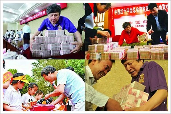他怕人说他诈捐,所有捐款只捐现金,现场给,拍照为证。