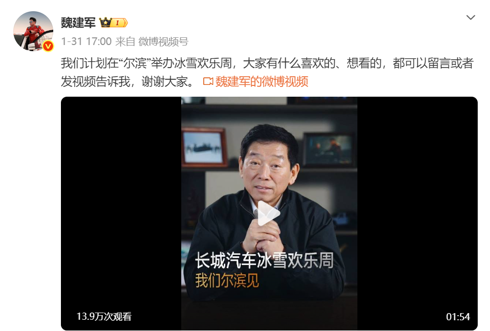 2026年1月的最后一天,长城汽车董事长魏建军突然通过社交平台宣布,今年的冰雪欢乐周落户哈尔滨,并“征集玩法攻略”,活动于2月6日开始。