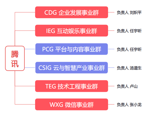 MIG(互联网事业群)、OMG(网络媒体事业群)、SNG(社交网络事业群)全部打散,to C部分被收编进新设的PCG(平台与内容事业群)、to B部分收入CSIG(云与智慧产业事业群)中。